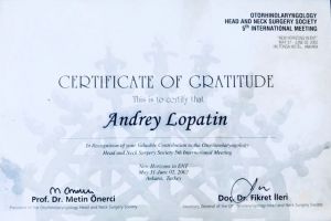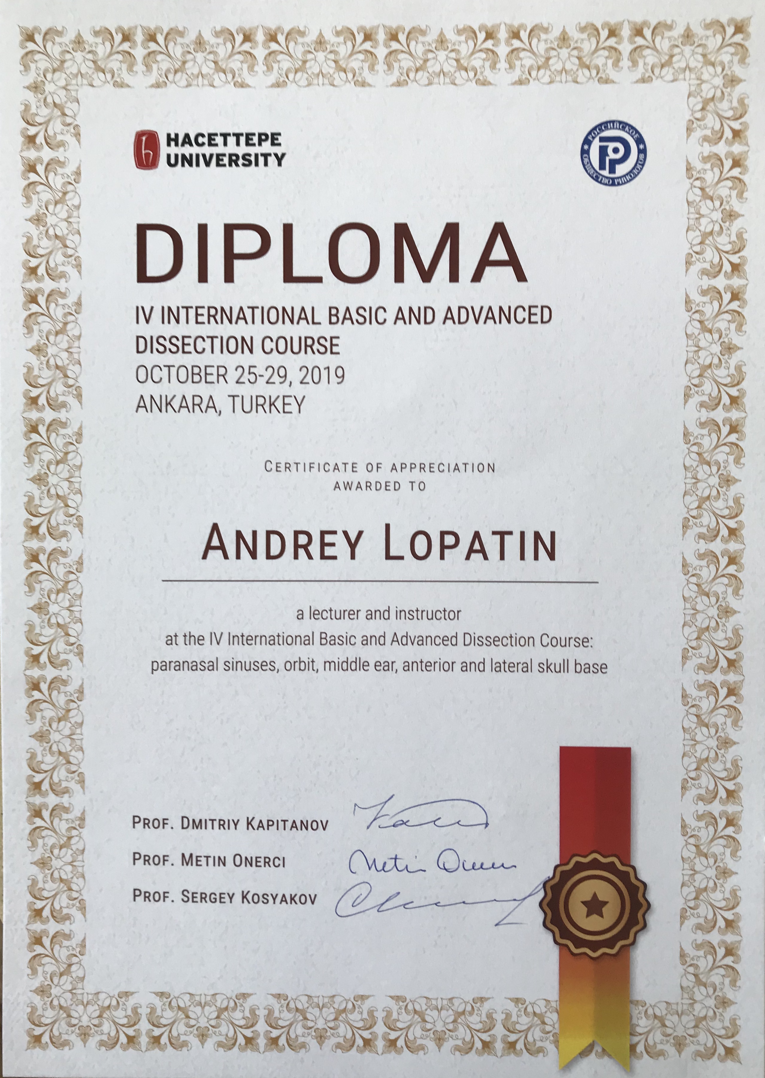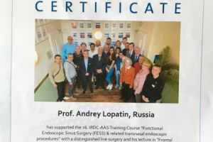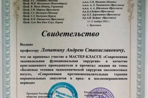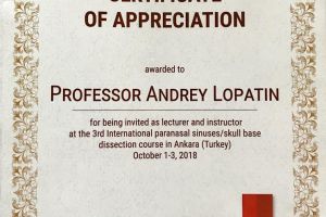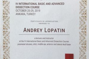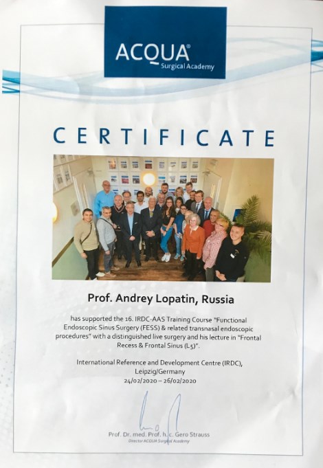 - В конце 90-х годов в сотрудничестве со специалистами НИИ нейрохирургии им. акад. Н.Н. Бурденко, А.С. Лопатин начал развивать еще одно новое направление – «ринонейрохирургию» - трансназальные хирургические вмешательства на основании черепа и смежных с околоносовыми пазухами анатомических структурах. Впервые в нашей стране им были выполнены внутриносовые эндоскопические операции по удалению опухолей гипофиза и передних отделов основания черепа, юношеских ангиофибром носоглотки, пластическое закрытие ликворных свищей при носовой ликворее, декомпрессия орбиты при эндокринной офтальмопатии (болезни Грейвса). Результаты одной из самых больших в мире серии хирургических вмешательств при носовой ликворее и менингоэнцефалоцеле, позволивших излечить от этого опасного заболевания до 97% оперированных пациентов, опубликованы в высокорейтинговых международных журналах и высоко оценены зарубежными коллегами, занимающимися этой проблемой (Endonasal endoscopic repair of spontaneous cerebrospinal fluid leaks. Arch Otolaryngol Head Neck Surg 2003; 129:859-863; Spontaneous CSF Leaks and Meningoencephaloceles: Endoscopic Repair and Possible Etiology. Otorhinolaryngology Clinics Int Journal 2012; 3:151-155).